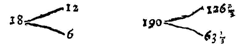 For let the parts of the yard be 12. and 6. and the summe of them 18. Now as 18. is unto 12. so is the whole altitude uy, 190. foote, unto the excesse 126⅔ foote. The remainder therefore 63⅓ foote, shall be as, the lesser heighth sought.