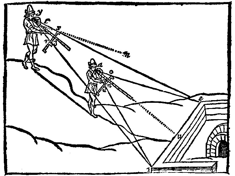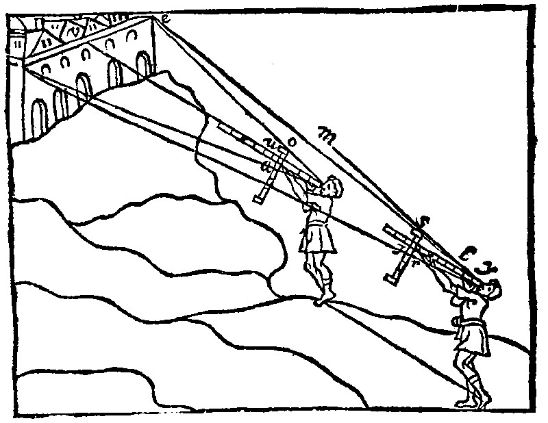 The same shall be the geodesy or manner of measuring, if thou wouldest from some higher place, measure the breadth that is beneath thee, as in the last example. But from the distance of two places, that is, from latitude or breadth, as of Trees, Mountaines, Cities, Geographers and Chorographers do gaine great advantages and helpes.