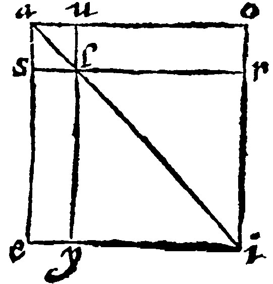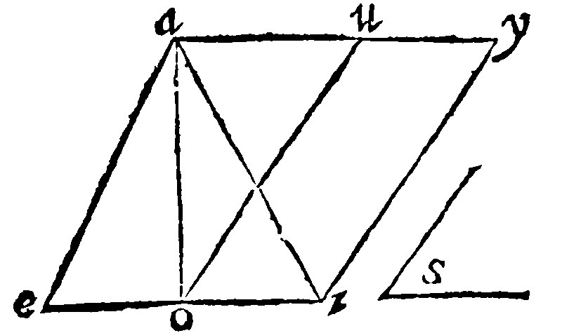 Againe, it is proportionall to it in the shankes of the equall angles. For the triangles auy, and aei, are alike, by the 12 e vij, because uy is parallell to the base. Therefore as au is uy; so is ai to ei: Then as uy is to ya; so is ei to ia. Againe by the 21 e v, because sy is parallell to the base io, as ay is to ys: so is ai, to io: Therefore equiordinately, as uy is to ys: so is ei to io: Item as sy is to ya, so is io to ia: And as ya is to as: so is ia to ao. Therefore equiordinately, as ys is to sa: so is io to oa. Lastly as sa is unto ay; so is oa unto ai: And as ay is to au; so is ai unto ae. Therefore equiordinately, as sa is to au: so is ao, to ae. Wherefore the Diagonall su is proportionall in the shankes of equall angles to the parallelogramme oe.