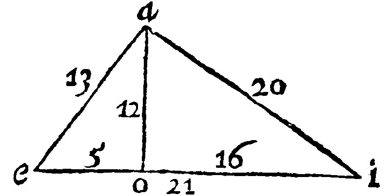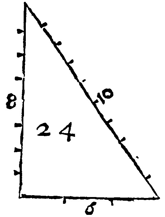 As for example, Let the sides of the triangle aei, be 6. 8. 10: The summe 24. the halfe of the summe 12. From which halfe subduct the sides 6. 8. 10. and let the remaines be 6. 4. 2. Now multiply continually these foure numbers 12. 6. 4. 2. and thou shalt make first of 12. and 6. 72. Of 72. and 4. 288. Lastly, of 288. and 2. 576. And the side of 576. by the 16. e. shall be found to be 24. for the content of the triangle: which also here will be found to be true, by multiplying the sides ae and ei, containing the right angle, the one by the other; and then taking the halfe of the product.