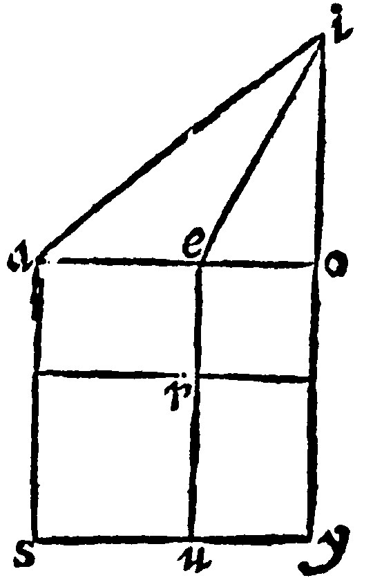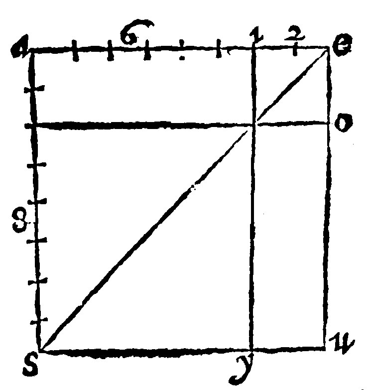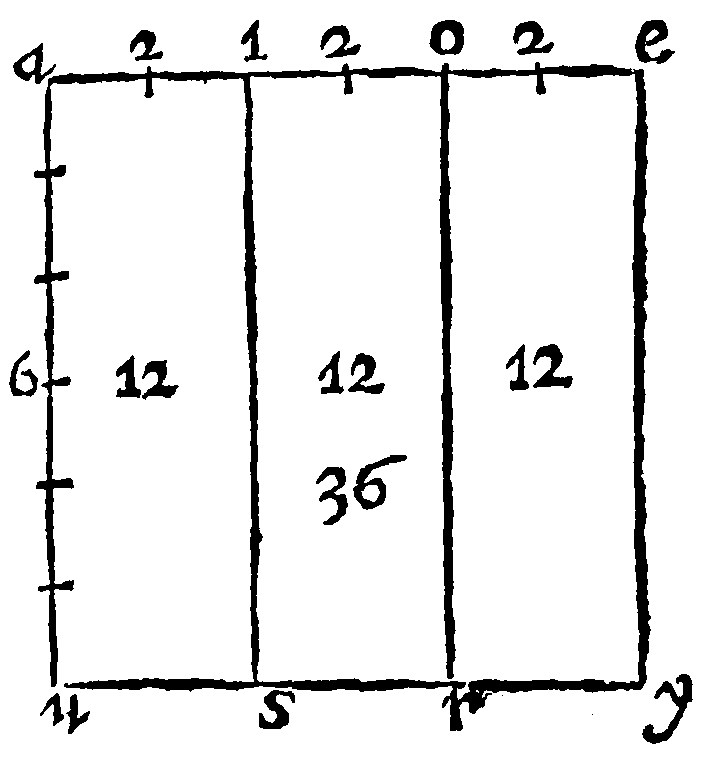 As let the line ae, 6. be cut into ai, 2. io. 2. and oe, 2. The Oblongs as, 12. ir, 12. and oy, 12. made of the whole ae, and of those segments, are equall to ay, the quadrates of the whole.