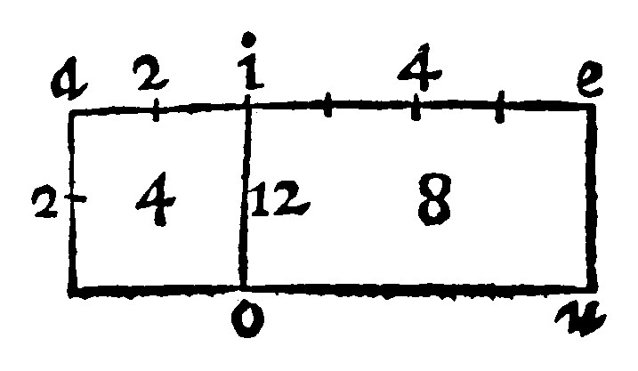 As let the right line ae, be 6. And let it be cut into two parts ai, 2. and ie, 4. The rectangle 12. made of ae, 6. the whole, and of ai, 2. the one segment, shall be equall to iu, 8. the rectangle made of the same ai, 2. and of ie, 4. And also to ao, 4. the quadrate of the said segment ai, 2.