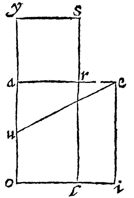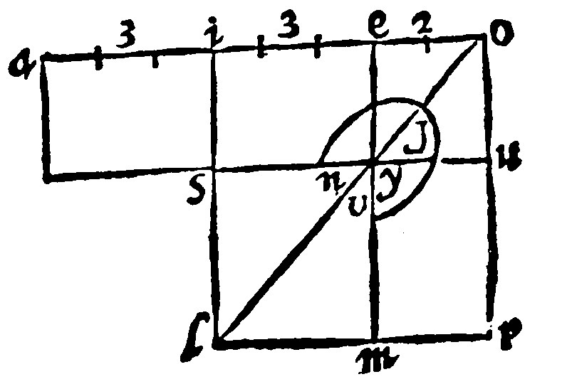 As for example, let the line ae 6, be cut into two equall portions, ai 3, and ie 3: And let it be continued unto eo 2: The oblong 16, made of 8 the continued line, and of 2, the continuation; with 9 the quadrate of 3, the halfe, (that is 25.) shall be equall to 25, the quadrate of 3, the halfe and 2, the continuation, that is 5. This as the former, may geometrically, with the helpe of numbers be expressed. For by the 26 e x, as is equall to iy: And by the 19 e x, it is equall to yr, the complement. To these equalls adde so. Now the oblong au, shall be equall to the gnomon nju. Lastly, to the equalls adde the quadrate of the bisegment or halfe. The Oblong of the continued line and of the continuation, with the quadrate of the bisegment, shall be equall to the quadrate of the line compounded of the bisegment and continuation. These were the rates of an oblong with a rectangle.