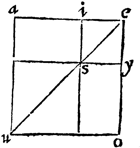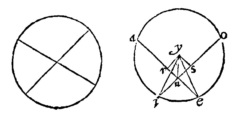 If the inscripts thus cut be diameters, the proportion is manifest, as in the first figure. For the Rectangle of the segments, of the one is equall to the rectangle of the segments of the other, seeing they be both quadrates of equall sides. If they be not diameters let them otherwise as ae, and io: I say the Oblong of au, and ue, is equall to the Oblong of ou, and ui. For let the raies from the Center y, be ye, and yi. To the quadrate of each of these both the rectangles of the segments shall be equall. For by the 7 e, let the diameter yu, fall upon the point of the common section u; And let ys, and sr, be perpendiculars. Here by the 5 e xj. the inscripts are cut equally in the points r and s: And unequally in the point u: Therefore by the 7 e xiij, the oblong, of ou, and ui, with the quadrate su, is equall to the quadrates si; And adding ys, the same oblong, with the quadrates us and sy, that is, by the 9 e xij, with the quadrate yu, is equall to the quadrates is and sy, that is, by the 9 e xij, to the quadrate iy, that is, by the 5 e xij, to ye, to the which by the same cause it is manifest the other oblong with the quadrate yu is equall. Let the quadrate yu, bee taken from each of them: And then the oblongs shall be equall to the same: And therefore betweene themselves.