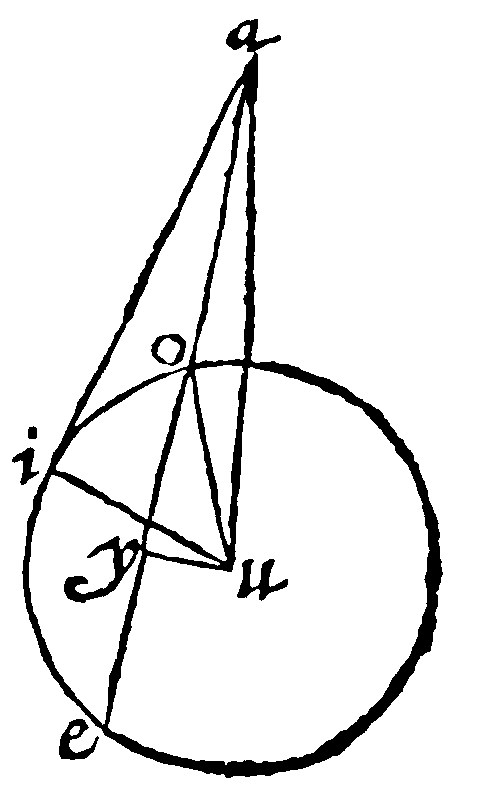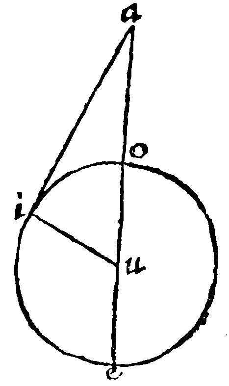 If the secant or cutting line do passe by the center, the matter is more easie and as here, Let ae, cut; And ai, touch: The outter segment is ao, and the center u, Now ui, shall be perpendicular to the tangent ai, by the 20. e: Then by 8 e xiij, the oblong of ea, and ao, with the quadrate of au, that is, of iu, is equall to the quadrate of au, that is, by the 9 e xij. to the quadrates of ai, and iu. Take iu, the common quadrate: The Rectangle shall be equall to the quadrate of the tangent.