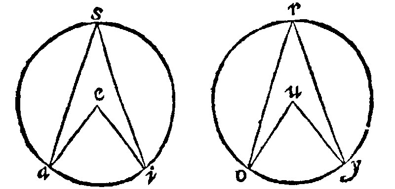 The second example is thus of the angle in the center aei: And in the periphery aoi. Here the shankes eo, and ei, by the 28 e iiij, are equall: And by the 17 e vj, the angles at o and i are equall: To both which the angle in the center is equall, by the 15 e vj. Therefore it is double of the one.