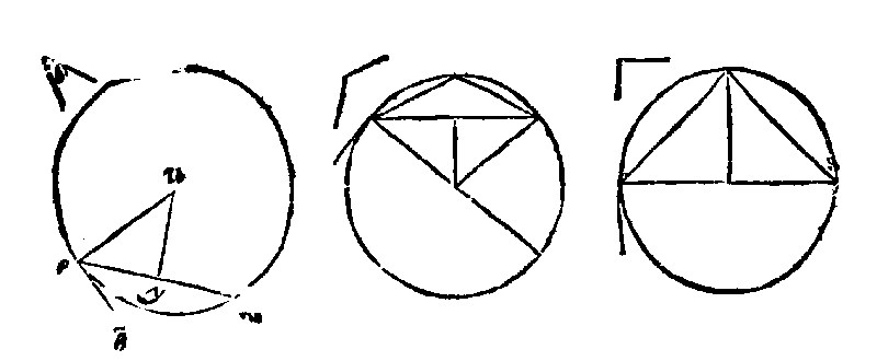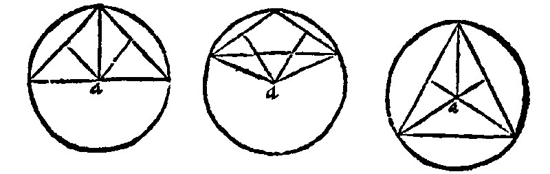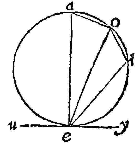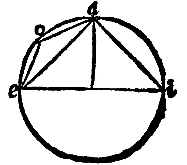 21 The angle in a semicircle is a right angle: The angle of a semicircle is lesser than a rectilineall right angle: But greater than any acute angle: The angle in a greater section is lesser than a right angle: Of a greater, it is a greater. In a lesser it is greater: Of a lesser, it is lesser, è 31. and 16. p iij.