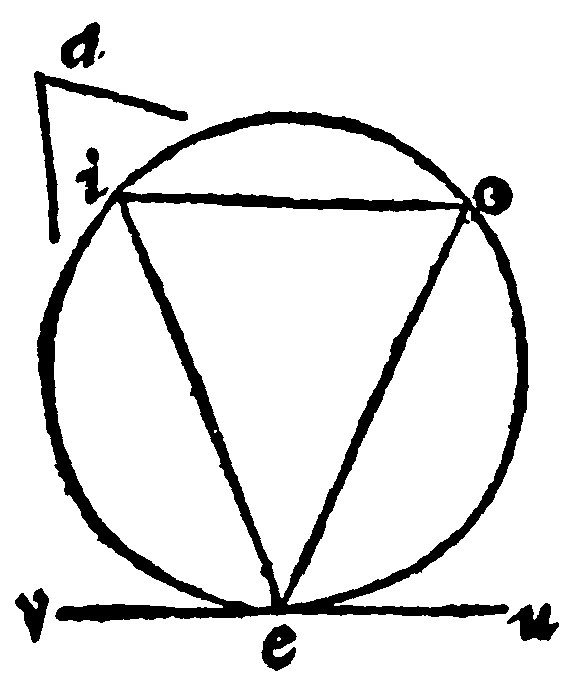 Secondarily, the angles at a, and i, are equall to two right angles, by the 14, e: To these are equall both oey, and oeu. But eao, is equall to the alterne oey. Therefore that which is at i, is equall to, the other alterne oeu. Neither is it any matter, whether the angle at a, be at the diameter or not: For that is onely assumed for demonstrations sake: For wheresoever it is, it is equall, to wit, in the same section. And from hence is the making of a like section, by giving a right line to be subtended.
