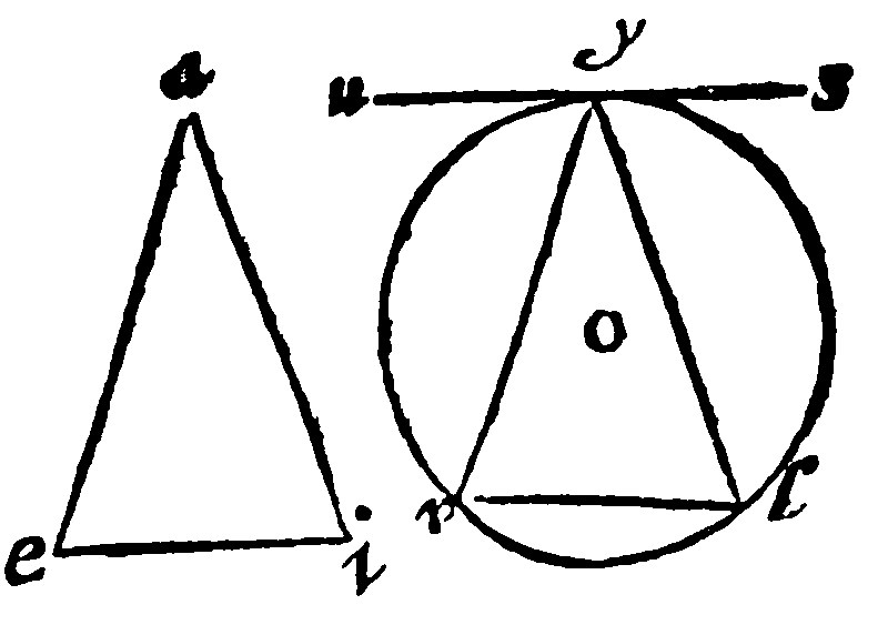 Let there be a Triangle, and in it the outter angles aei, and aou: The Circle let it be ysr; And in the center l, let the angles ylr, and slr; at the common side lr, bee made equall to the said outter angles aei, and aou. I say the angles of the circumscribed triangle, are equall to the angles of the triangle given. For the foure inner angles of the quadrangle ylrm, are equall to the foure right angles, by the 6 e x: And two of them, to wit, at y and r, are right angles, by the construction: For they are made by the secant and touch line, from the touch point by the center, by the 20 e xv. Therefore the remainders at l and m, are equall to two right angles: To which two aei and aeo are equall. But the angle at l, is equall to the outter: Therefore the remainder m, is equall to aeo. The same shall be sayd of the angles aoe, and aou. Therefore two being equall, the rest at a and i, shall be equall.