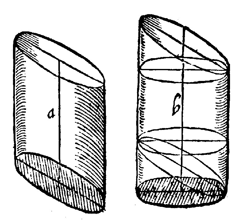 If the cylinder in the opposite bases be oblique, then if what thou cuttest off from one base thou doest adde unto the other, thou shalt have the measure of the whole; as here thou seest in these cylinders, a and b.