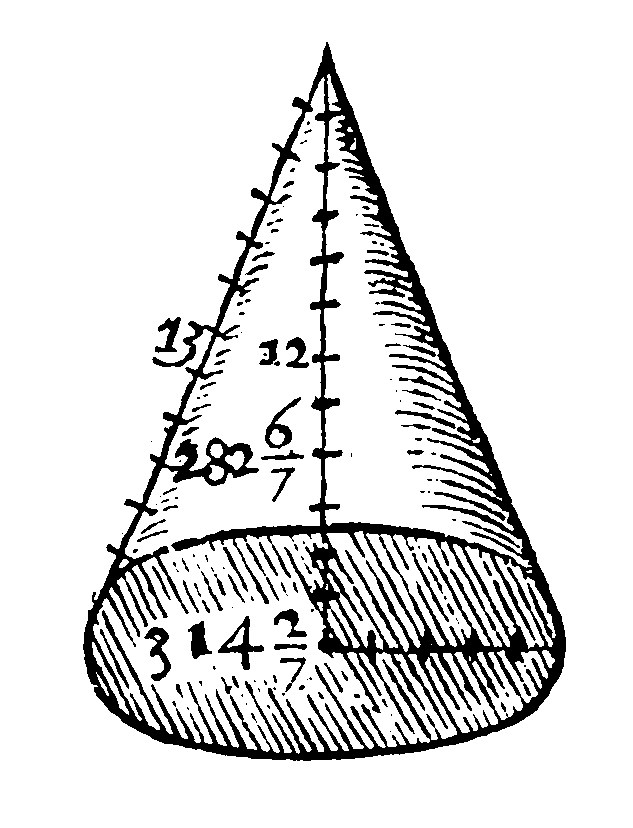 The heighth is thus had. If the square of the ray of the base, be taken out of the square of the side, the side of the remainder shall bee the heighth, as is manifest by the 9 e xij. Here therefore the square of the ray 5, is 25. The square of 13, the side is 169. And 169 – 25, are 144; whose side is 12 for the heighth: The third part of which is 4. Now the circular base is 78.4/7: And the plaine of these is 314.2/7 for the solidity of the Cone.