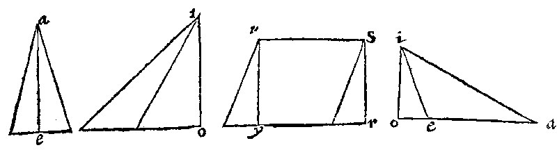 Altitudo, the altitude, or heigth, or the depth: [For that, as hereafter shall bee taught, is but Altitudo versa, an heighth with the heeles upward.] As in the figures following are ae, io, uy, or sr. Neither is it any matter whether the base be the same with the figure, or be continued or drawne out longer, as in a blunt angled triangle, when the base is at the blunt corner, as here in the triangle, aei, is ao.