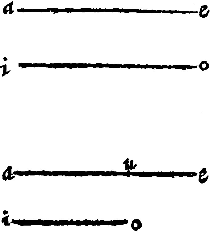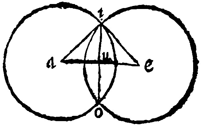 As let the Right line given be ae. And to i. a point assigned, grant that io. equall to the same ae. may bee set. Item, in the second example, let ae. bee greater then io. And let there be cut off from the same ae. by applying of a rular made equall to io. the lesser, portion au. as here. For if any man shall thinke that this ought only to be don in the minde, hee also, as it were, beares a ruler in his minde, that he may doe it by the helpe of the ruler. Neither is the fabricke in deede, or making of one right equal to another: And the cutting off from greater Right line, a portion equall to a lesser, any whit harder, then it was, having a point and a distance given, to describe a circle: Then having a Triangle, Parallelogramme, and semicircle given, to describe or make a Cone, Cylinder, and spheare, all which notwithstanding Euclide did account as principles.