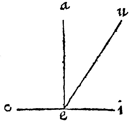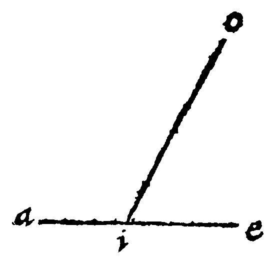 A right line standeth upon a right line, which cutteth, and is not cut againe. And the Angles on each side, are they which the falling line maketh with that underneath it, as is manifest out of Proclus, at the 15. pj. of Euclide; As here ae. the line cut: and io. the insisting line, let them be perpendicular; The angles on each side, to witt aio. and eio. shall bee right angles, by the 13. e iij.