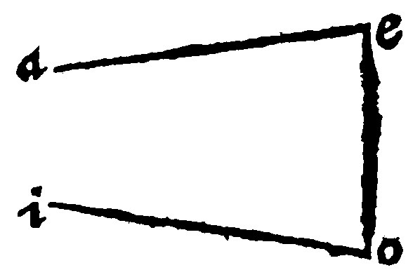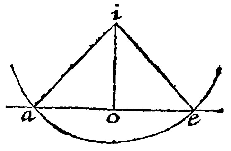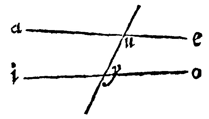 As here ae, and io, knit together with eo, doe make two angles aeo, and ioe, lesser than two right angles: They shall therefore, I say, meete if they be continued out that wayward. The assumption and complexion is out of the 21 e, of right lines in the same plaine. If right lines cut with a right line be parallels, they doe make the inner angles on the same part equall to two right-angles. Therefore if they doe not make them equall, but lesser, they shall not be parallel, but shall meete.