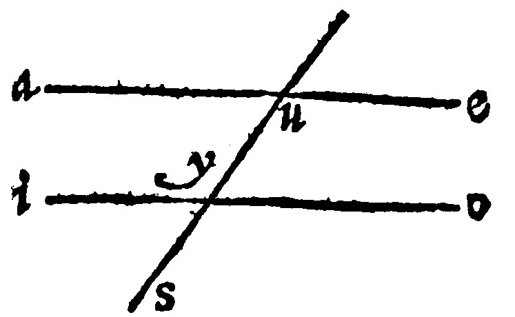 The paralillesme, or parallell-equality of right lines cut with a right line, concludeth a threefold equality of angles: And the same is againe of each of them concluded. Therefore in this one element there are sixe things taught; all which are manifest if a perpendicular, doe fall upon two parallell lines. The first sort of angles are in their owne words plainely enough expressed. But the word Alternum, alterne [or alternate, H.] here, as Proclus saith, signifieth situation, which in Arithmeticke signified proportion, when the antecedent was compared to the consequent; notwithstanding the metaphor answereth fitly. For as an acute angle is unto his successively following obtuse; So on the other part is the acute unto his successively following obtuse: Therefore alternly, As the acute unto the acute: so is the obtuse, unto the obtuse. But the outter and inner are opposite, of the which the one is without the parallels; the other is within on the same part not successively; but upon the same right line the third from the outer.