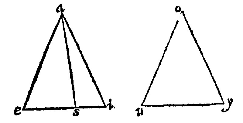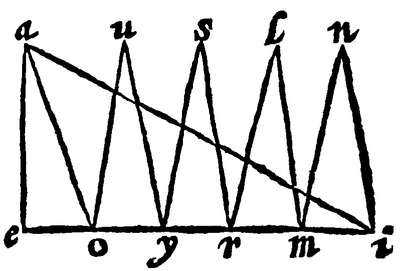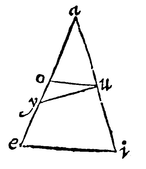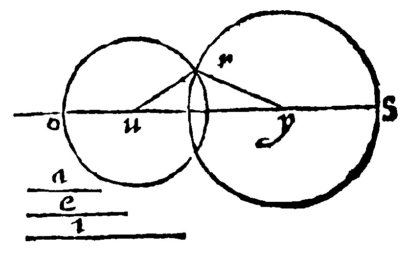 Let it be desired that a triangle be made of these three lines, aei, given, any two of them being greater than the other: First let there be drawne an infinite right; From this let there be cut off continually three portions, to wit, ou, uy, and ys, equall to ae, and i, the three lines given. Then upon the ends y, and u, at the distances ou, and ys; let two peripheries meet in the point r. The rayes from that meeting unto the said ends, u, and y, shall make the triangle ury: for those rayes shall be equall to the right lines given, by the 10. e v.