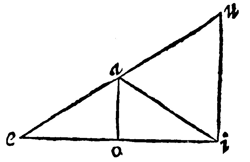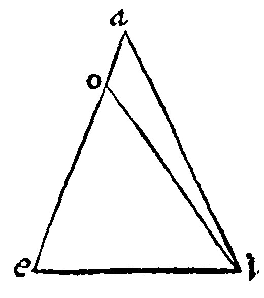 Thus farre of the reason or rate of equality, in the sides and angles of triangles: The reason of inequality, taken out of the common and generall inequality of angles, doth follow. The first is manifest, by the 9. e iij. as here thou seest in aei and ouy.