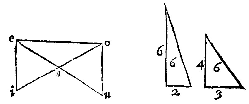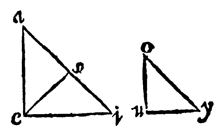 Direct proportion in triangles, is such as hath in the former beene taught: Reciprocall proportion followeth. It is a consectary drawne out of the 18 e iiij; which is manifest, as oft as the equall angle is a right angle: For then those shankes, [comprehending the equall angles,] are the heights and the bases; As here thou seest in the severed triangles. Notwithstanding in obliquangle triangles, although the shankes are not the heights, the cause of the truth hereof is the same. Yet if any man shall desire a demonstration of it, it is thus: Let therefore the diagramme or figure bee in the triangles aei, and aou: And the angles oau, and eai, let them be equall: And as ua is to ae, so let ia be unto ao: I say that the triangles aou, and eai, are equall. For eo being knit together with a right line, uao is unto oae, as ua is unto ae, by the 7 e: And ia, unto ao, by the grant, is as eai is unto eao. Therefore uao, and eai, are unto eao proportionall: And therefore they are equall one to another.