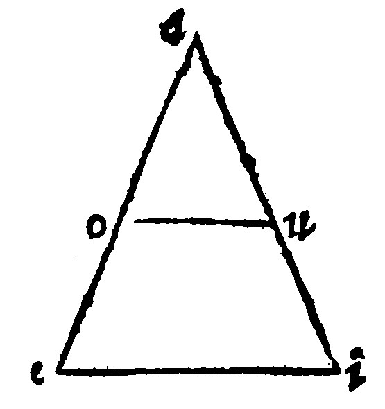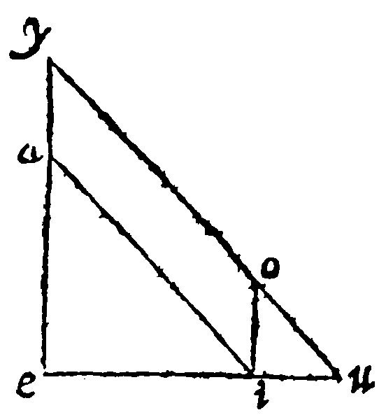 The comparison both of the rate and proportion of triangles hath in the former beene taught: Their similitude remaineth for the last place. Which similitude of theirs consisteth indeed of the reason, or rate of their angles and proportion of the shankes. Therefore for just cause was the reason of the angles set first: Because from thence not onely their reason, but also their latter proportion is gathered. Let aei and iou, be two triangles equiangled: And let them be set upon the same line eiu, meeting or touching one another in the common point i. Then, seeing that the angles at e and i, are granted to bee equall, the lines oi, and ae, are parallel, by the 21 e v. Therefore by the 22 e v uo and ea, being continued, shall meete. Item, The right lines ai, and yu, by the 21 e v, are parallel, because the angle aie is equall to oui, the inner opposite to it. Therefore seeing that ai is parallell to the base yu, by the 21 e v, ea shall be to ay, that is, by the 26 e v, to io, as ei is to iu: And alternly, or crosse wayes, ea shall be to ei, as io is to iu. This is the first proportion. Item, seeing that io is parallell to the base ye; yo, that is, by the 26 e v, ai shall bee unto ou, as ei, is unto iu: And crosse wise, as ai is unto ie, so is ou unto ui. This is the second proposition. Lastly, equiordinately: ae is to ai, as oi is to ou: wherefore if triangles be equiangled, they are proportional in shankes.