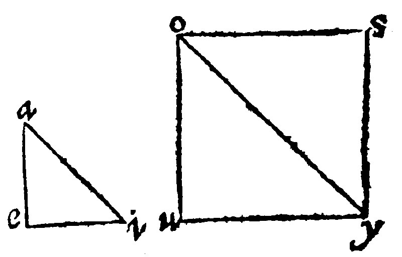 Let therefore the triangles given be aei, and ouy, equall in their angles a and o: And in their shankes let ea, be unto ai, as ou is to oy: And by the 11 e iij, let the angles soy, and oys, be equall to the angles eai, and eia: The other at s and e, shall be equall, by the 4 e. Here thou seest that the triangle aei, is equiangle unto oys. Now, by the 12 e. as ea is to ai: so is so to oy: and therefore, by the grant, so is uo to oy. Therefore seeing that uo, and os, are proportionall to oy, they are both equall. Lastly, if the common shanke oy bee added to both the shankes ou, and oy, are equall to the shankes so and oy. [But by the construction the angles oys and aie are equall. And, by the 4 e, the other at s and e are equall. Therefore the first triangle aei, is made equiangled to the third. Now seeing the second triangle uoy is to the third soy, equall in the shanks of the equall angle, it is to the same equilater, and by the 1 e, equiangled: Shon.] Wherefore the second triangle ouy shall likewise be equiangled to osy, the third: And therefore if two triangles proportionall in shankes be equall in the angle of their shankes, they are equiangles.