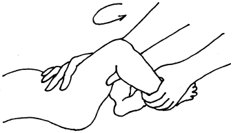 Одной рукой возьмите ребенка за бедро, другой – за голеностопный сустав или голень. Сгибайте в разные стороны (рис. 2). То же самое повторите с другой ногой.