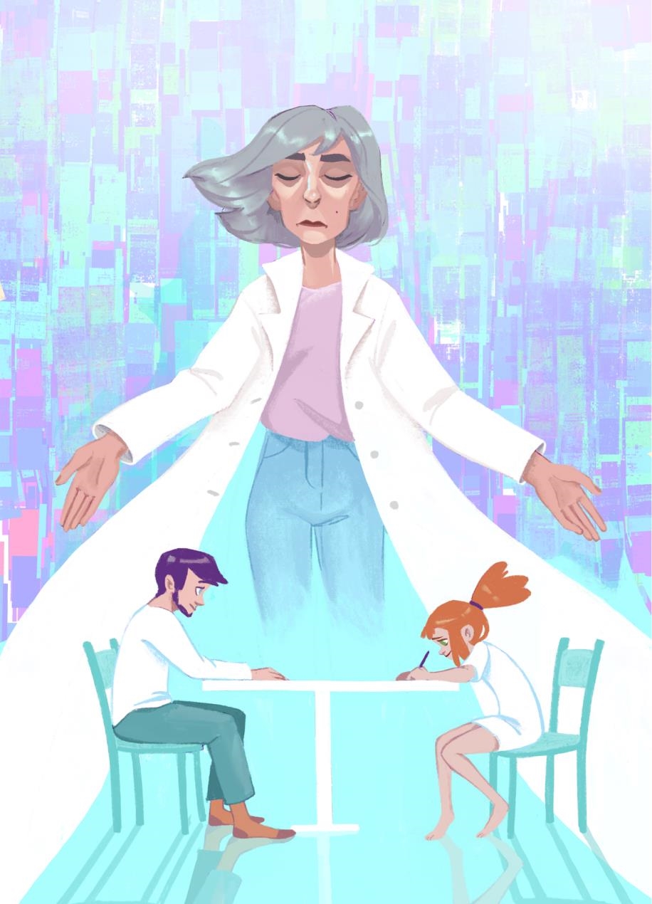 ⁂За стеклом стояла миловидная женщина лет пятидесяти в белом халате, с планшетом в руках и наушником в левом ухе. Переводя взгляд со стекла на экран планшета и обратно, она пристально следила за каждым действием молодых людей и тут же, в дополнительном экране-голограмме, висевшем справа от нее, вела какие-то заметки, корректировала протоколы. Сзади к женщине подошел коренастый старичок с аккуратно подстриженной серебристой бородой.