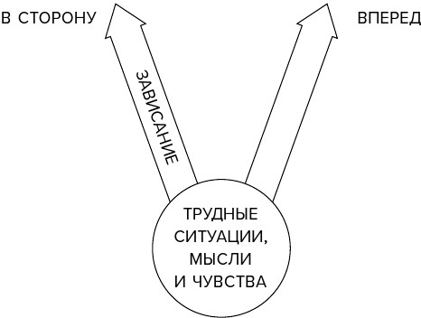 При возникновении таких трудных ситуаций, мыслей и чувств мы можем реагировать на них либо шагами вперед, либо шагами в сторону, как это показано на рисунке ниже.