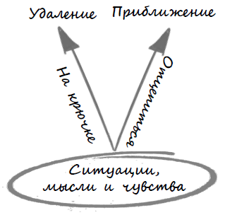 Терапевт продолжает: Проблема в том, что, когда возникают эти непростые мысли и чувства, большинство из нас попадается к ним «на крючок». Они как будто ловят нас, потом тянут к себе, дурачат нас и дергают в разные стороны. Вы понимаете, что я имею в виду? Они могут по-настоящему, реально держать нас «на крючке», так, что мы начинаем совершать разные движения руками, ногами и ртом. Они могут поймать наше внимание, и тогда, вместо того чтобы сосредоточиться на своем деле, мы теряемся в своем внутреннем мире. И чем крепче мы сидим «на крючке», тем больше движений удаления мы совершаем, так ведь?