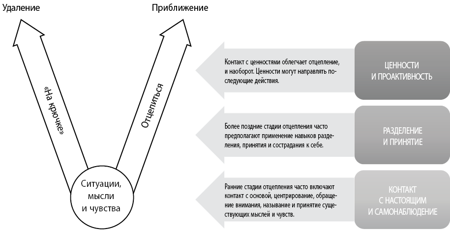 Навыки отцепления имеют отношение ко всем четырем основным процессам осознанности в АСТ: к когнитивному разделению, принятию, самонаблюдению и контакту с настоящим. Мы можем использовать любую комбинацию этих процессов, чтобы отцепиться от трудных мыслей и чувств, уменьшить их действие и влияние на внешнее и внутреннее поведение.
