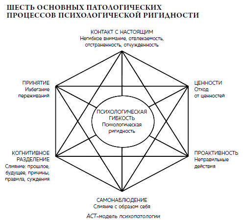 Как показано на следующей схеме, основные патологические процессы в АСТ включают в себя: когнитивное слияние, избегание переживаний, негибкое внимание, отчуждение от ценностей, неправильные действия и слияние с образом себя. Любой из этих процессов или сразу несколько из них могут спровоцировать психологическую ригидность. Вы можете представить их себе как обратные стороны основных терапевтических процессов, повышающих психологическую гибкость. По мере того как мы будем ими заниматься, я покажу вам примеры клиентов с клинической депрессией, иллюстрирующие каждый процесс.