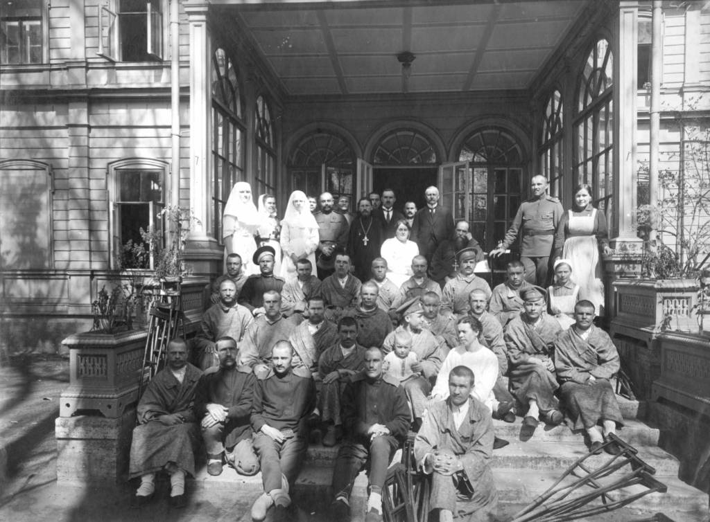 Фото 61. Анна Александровна среди своих раненых на крыльце Серафимовское убежища-лазарета. Царское Село.