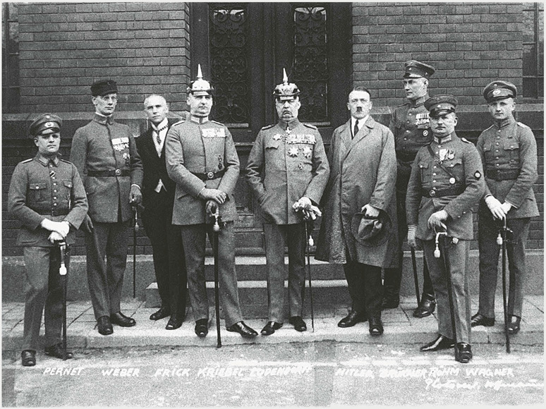 Die Hauptangeklagten im Hitler-Prozess 1924 (von links nach rechts): Heinz Pernet, Friedrich Weber, Wilhelm Frick, Hermann Kriebel, Erich Ludendorff, Adolf Hitler, Wilhelm Brückner, Ernst Röhm und Robert Wagner.