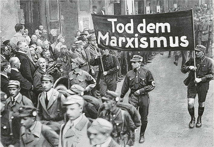 »Hitler schien uns in jenen Augenblicken mehr zu sein als ein Politiker«: der »Führer« am Reichsparteitag in Weimar 1926. Noch marschieren viele im bürgerlichen dunklen Anzug in Hitlers Reihen, bald werden nur mehr braune Uniformen zu sehen sein.