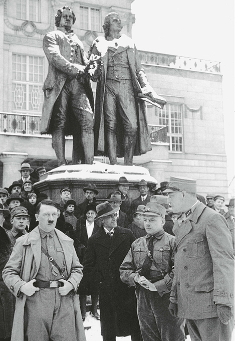 Die Dichterfürsten der Klassik werden als Schirmherren der nationalsozialistischen »Bewegung« missbraucht: Hitler mit Wilhelm Frick, Staatsminister für Inneres und Volksbildung, Fritz Sauckel, dem Gauleiter Thüringens, und seinem Adjutanten Wilhelm Brückner vor dem Goethe-Schiller-Denkmal in Weimar, 1931.