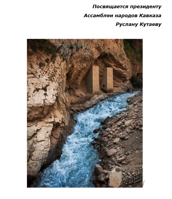 Сегодня, острота борьбы ничуть не ослабла, напротив, увядающая Российская империя стала непредсказуемой, более опасной и жестокой. Когда кругом все озлоблены, напуганы, клевещут друг на друга, предают друг друга, есть человек, не останавливаясь ни перед чем, не различая людей по религии и национальности, идущий вперед ради торжества справедливости. Соратник и продолжатель дела Гамсахурдия и Дудаева он не изменил своим принципам и не свернул с избранного пути. Он делает все, чтобы укрепить горские традиции и вернуть доверие и дружбу народам Кавказа. Он наиболее больше походит на героев моего романа, книга посвящается президенту «Ассамблеи народов Кавказа» – Руслану Кутаеву.