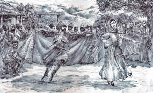 Как и положено у горцев, первый танец исполнил старец. Несмотря на свой возраст, он легко закружился в ритме музыки, лишь в движениях его не было страсти, присущей влюбленным. Девушка-горянка, словно лебедь по воде, плыла в танце, то приближаясь, то отдаляясь от партнера.
