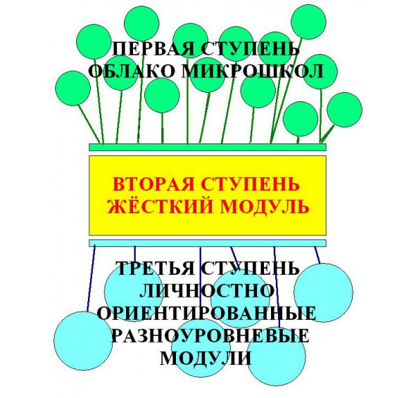 Вторая ступень – маточная макрошкола жесткого модуля, окруженная облаком специальных микрошкол (секций, кружков, коллективов) полужесткого и гибкого модулей. Подробнее об этом в дальнейшем изложении.