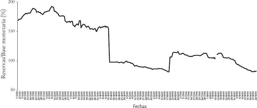 La diferencia clave es que Argentina no tenía un sistema completamente automático. El Banco Central de la República Argentina (BCRA) simplemente no expandía o reducía la oferta de pesos de acuerdo con la demanda del público, como ocurre en una caja de conversión ortodoxa. [...] Como muestran las estadísticas (ver Gráfico 2), las reservas del BCRA durante el 2001 variaron de 193 a 82 por ciento. El comportamiento del BCRA hizo que la gente dudara sobre si el peso era realmente tan bueno como el dólar. [...] Las dudas se intensificaron a partir de las medidas que tomó Domingo Cavallo cuando fue nombrado Ministro de Economía en abril. Por ejemplo, Cavallo introdujo un tipo de cambio especial para las exportaciones. Un sistema dolarizado no tiene estos problemas porque no existe una moneda nacional separada que pueda usar el banco central como una herramienta para un errado manejo monetario. Bajo un sistema de caja de conversión ortodoxa la línea que muestra la relación entre las reservas y la base monetaria (ver Gráfico 2) sería una línea recta en el 100 %. Con la dolarización es similar: incrementos en dólares se traducen directamente en incrementos de las reservas del sistema bancario.
