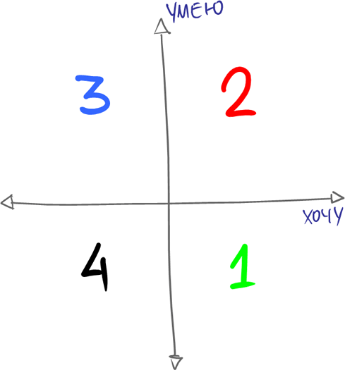 Таким образом, мы получаем двухфакторную модель с осями Х и У (Х – хочу, У – умею). Попутно заметим: «умею» не равно «могу». «Могу» включает в себя как «умею», так и ресурсы, необходимые для выполнения задачи. Существует множество ситуаций, когда вы умеете, но не можете: умею и хочу копать, но лопаты нет – не могу копать.