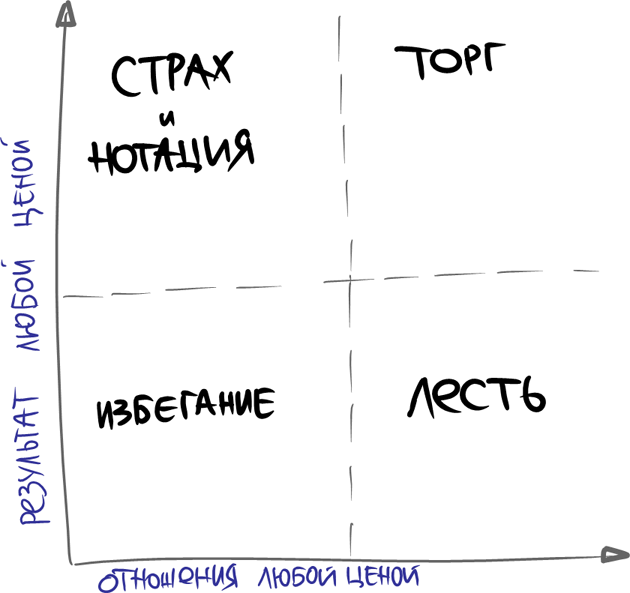 Для наглядности построим матрицу отношений, которую условно назовём «Матрицей Страх-Торг-Лесть». Взгляните на следующий рисунок.