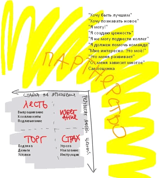 Как видим, предыдущая матрица (Страх-Торг-Лесть) – лишь небольшая часть способов управления. Огромное пространство открывается именно там, где находятся мотивы, в неё не вошедшие. Ключевым словом во всех из них является слово «Я» или «Сам». Весь этот сектор мы назовём ПАРТНЁРСТВО.