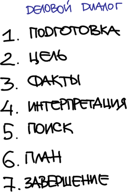 Надеюсь, ваш руководитель в работе с вами использует только последнее. Как было указано выше, часто разговор сводится к нотации или другого рода манипулятивной технике. Но если ваш руководитель реально хочет понять, что является причиной вашего деструктивного поведения, то ему придётся воспользоваться схемой Делового Диалога, которая зеркально отражает схему Разрушения Настроя, являясь ключом к этому замку.
