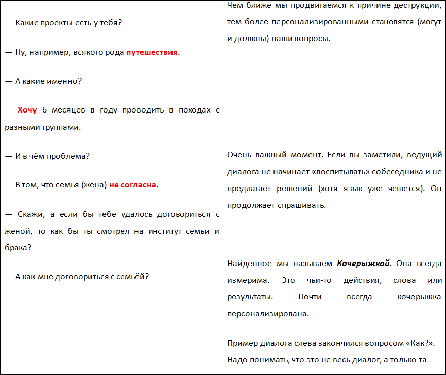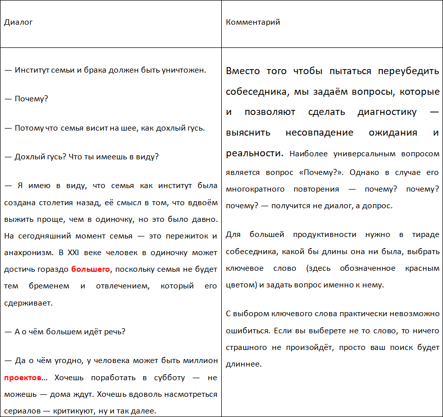 Вместо того чтобы пытаться переубедить, переломить, противостоять собеседнику, мы попытаемся понять, что стоит за его высказыванием. В данном примере фраза «Институт семьи и брака должен быть уничтожен» (смысл которой можно свести к девизу «Нет семье!») представляет то деструктивное поведение, которое мы бы хотели понять. Техника РКС основана на утверждении, что в любой фразе собеседника
