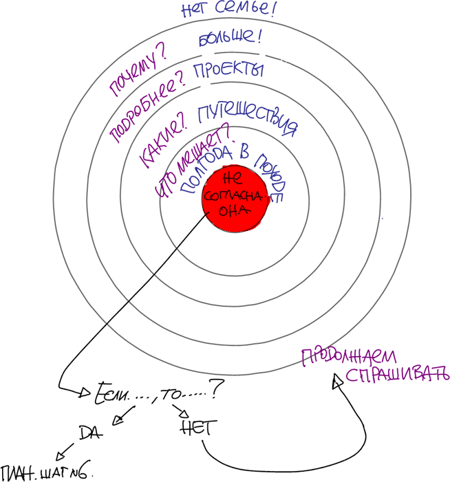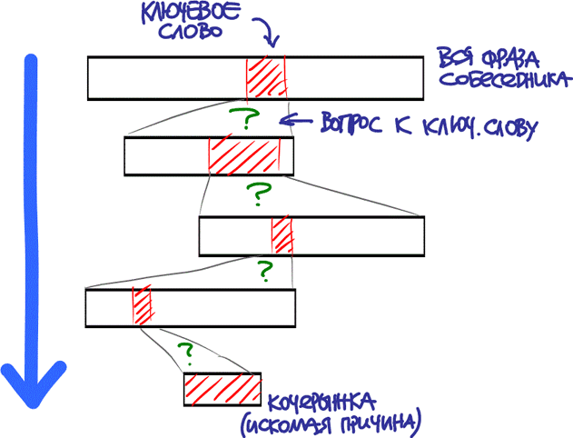Таким образом, мы начинаем с общего, с того, что человек показывает как свою позицию. Однако, понимая схему Разрушения Настроя, мы осознаём, что это лишь внешнее проявление, верхушка айсберга, мигающий индикатор. Задача – пробраться вглубь, в центр. А для этого необходимо сделать то, что не сделал ваш собеседник, – поиск, диагностика.