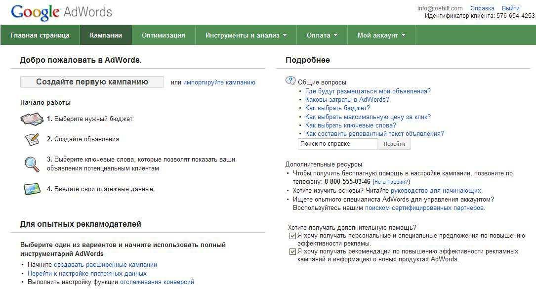 Далее нам надо зарегистрироваться в Google Adwords. Когда вы войдете в интерфейс Adwords, он будет выглядеть примерно так: