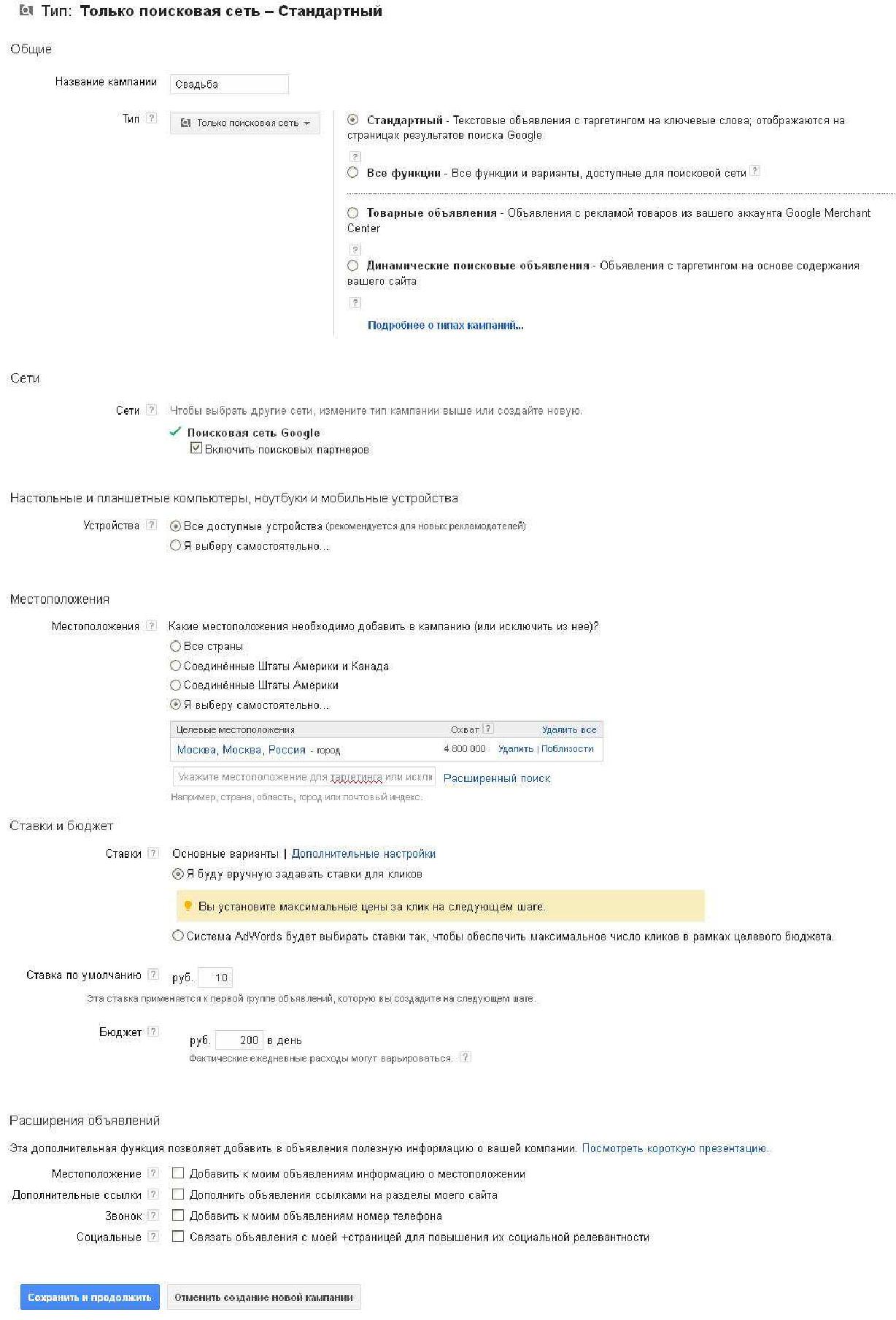 · Тип – только поисковая сеть, Стандартный. Нас не интересует реклама на других площадках.