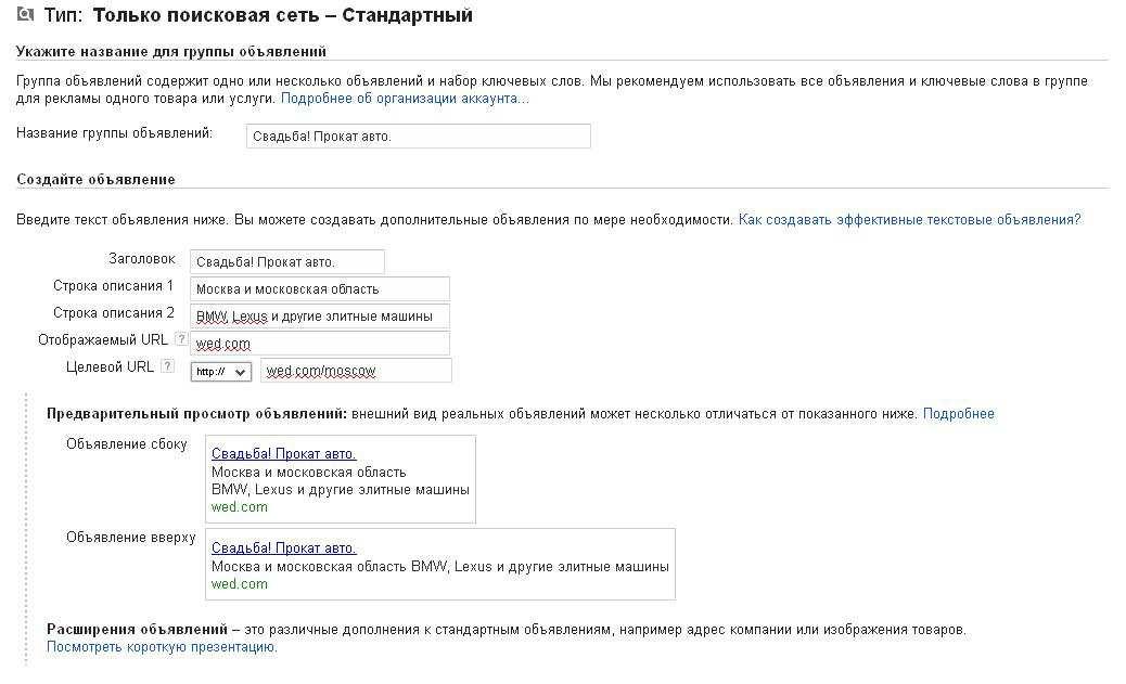 Допустим, мы занимаемся прокатом авто в Москве. Возьмем простейший запрос « Прокат авто Москва свадьба». И далее для него мы создадим рекламное объявление в Google Adwords.