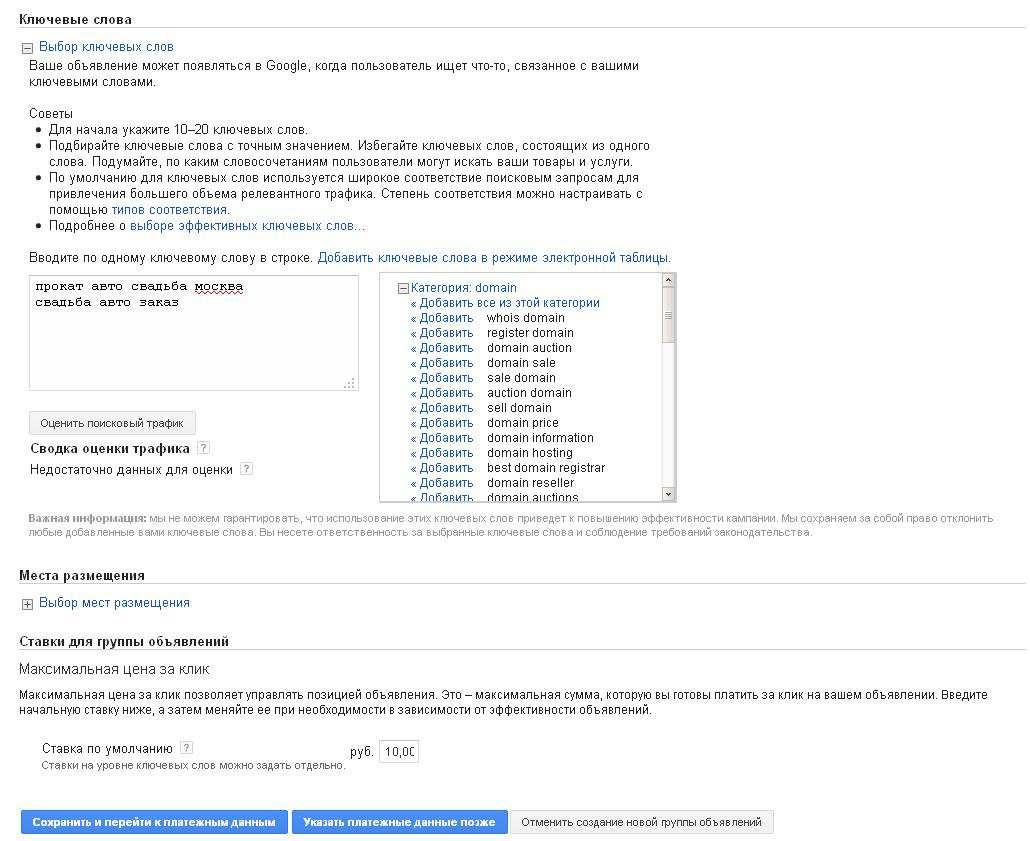 Обязательно указывайте как можно точнее таргетинг, иначе ваши деньги будут вылетать “в трубу”. Если вы укажете слишком широкий таргетинг, то это скажется на вашем CTR (число кликов к числу показов объявления), а значит и на стоимости вашей рекламной компании (это утверждение справедливо для Google Adwords).