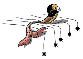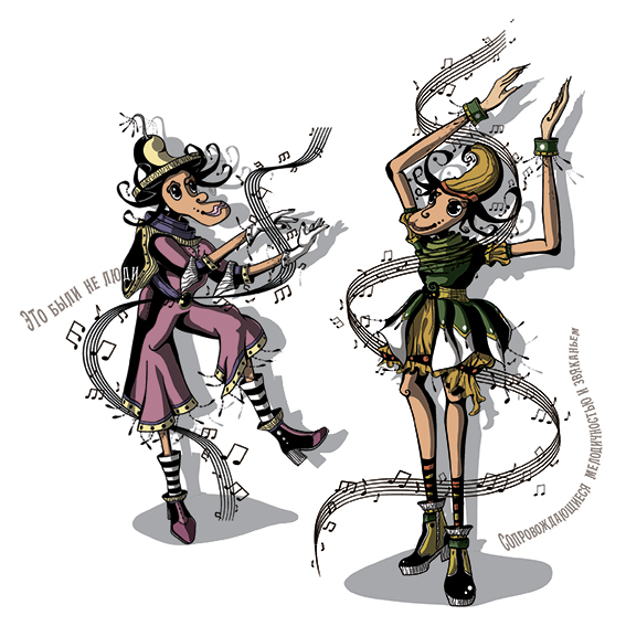 Мы снова обошли вокруг парящего дома, тщательно проверяя стены, но безуспешно. Вдруг откуда ни возьмись послышались голоса, сопровождающиеся мелодичностью и звяканьем, будто кто-то тихонько стучал хрустальными палочками. Не совсем чёткие, но довольно реальные. Из-за угла показалось два…человека? Нет, это были не люди. Звери? Тоже нет. Так кто же это? Причудливые наряды с узорами весьма неплохо вписывались в атмосферу парящего дома. Один из них поднял руки над головой, прохлопывая три раза, одновременно скручивая губы трубочкой и дуя вперёд. И всё бы ничего, как послышался звук колокольчика, а перед глазами, как по волшебству, появилась метёлка. Ну знаете, такая как у ведьм, на которых они летают. Не успели мы понять, что произошло, как метла с пассажирами взмыла в небо, отдаляясь от нас на невероятной скорости, оставляя след лёгкой мелодии.
